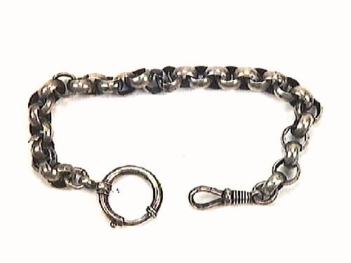En klockkedja, troligen av silver. Kedjan verkar handgjord, ändstyckena däremot kan vara fabriksgjorda, stämplat "830 S".