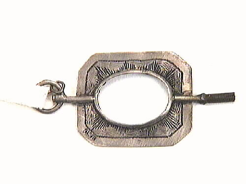 En rektangulär urnyckel av silver, med avhuggna hörn, en oval öppning i mitten och en förlängning nedåt bildar nyckel.