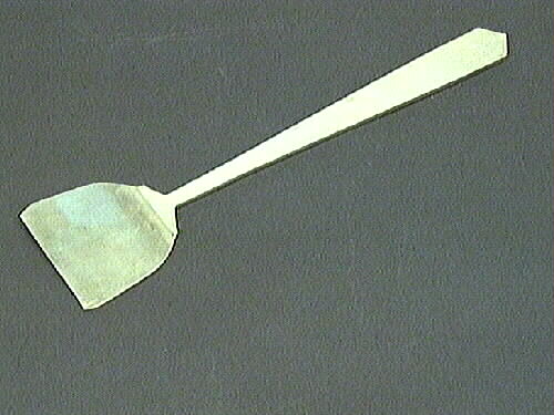 Skedämne i nysilver, tvärvalsat, färdigt för prägling, dessertsked. Föremålet ingår i en serie som visar tillverkningsleden vid besticktillverkning. Serien har använts av givaren vid föreläsning. Den kompletta serien utgörs av 5M16-4318 t o m 5M16-4324.