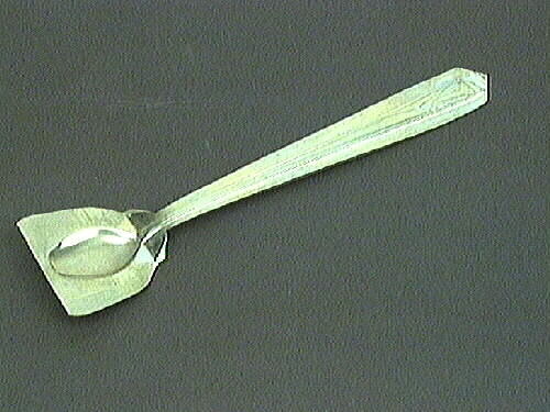 Skedämne, valsat och präglat, färdigt för skäggklippning, dessertsked. Föremålet ingår i en serie som visar tillverkningsleden vid besticktillverkning. Serien har använts av givaren vid föreläsning. Den kompletta serien utgörs av 5M16-4318 t o m 5M16-4324.