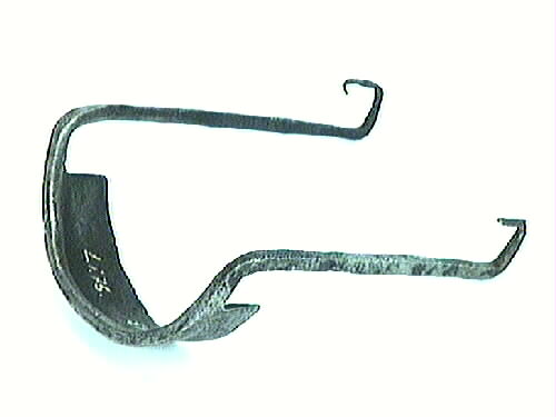 Skavjärn. Skave bestående av i ett stycke smitt bågformigt järn med två utskjutande ändar som skall gå in i trähandtag. Handtagen saknas. Sliten egg. (Använt för utformning av trätakrännor.)