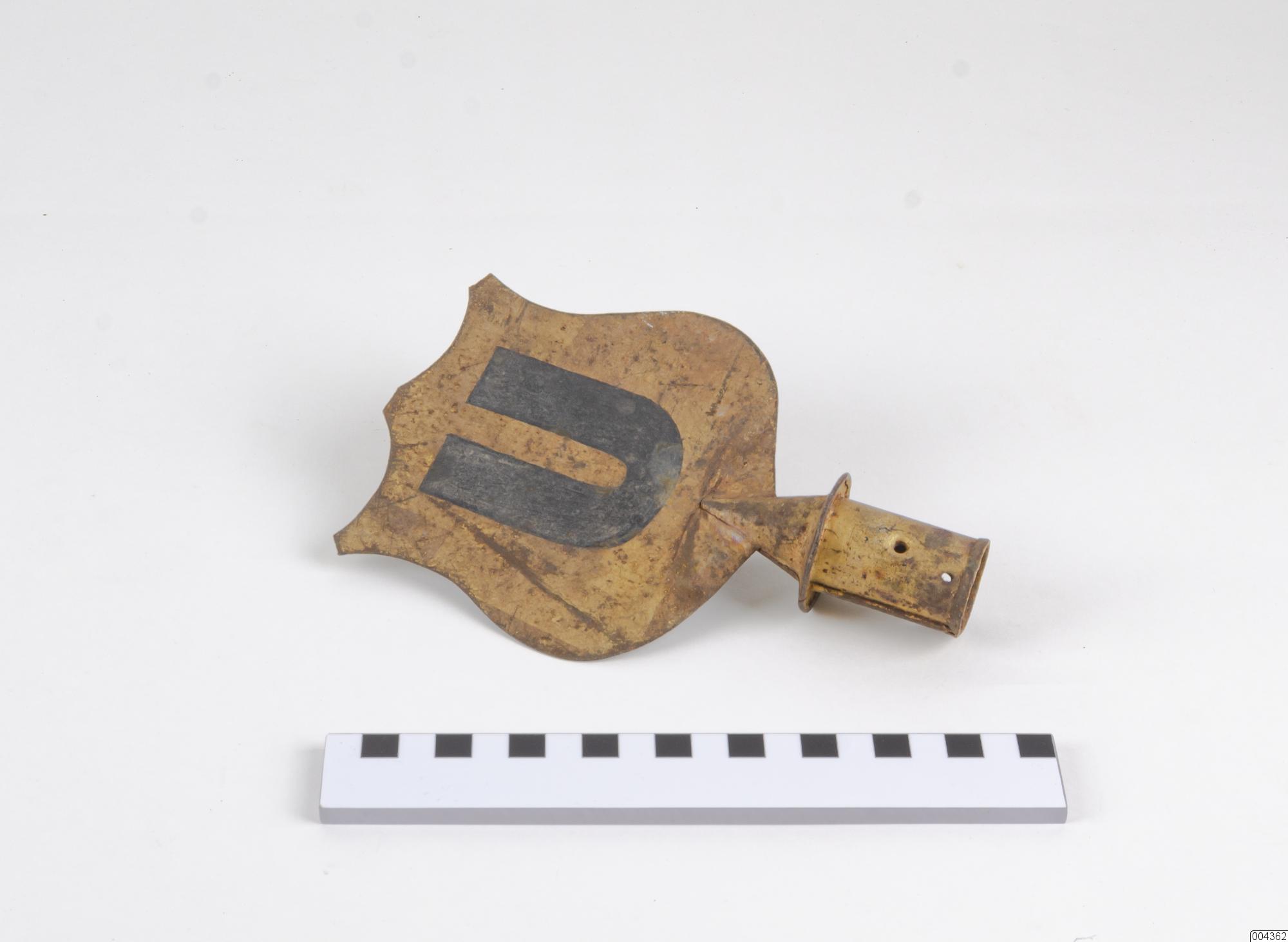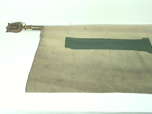 Fana i oblekt tuskaft med en grön infälld stapel. Stången är rundstång i obehandlat trä och överst är en metallsköld fäst, skuren, gulmålad med ett svartmålat U på båda sidor, skölden lös på stången. Fanan har troligen använts av brandkåren. Fanan är mycket smutsig, malskadad. Metallskölden är rostig, färgen delvis av.