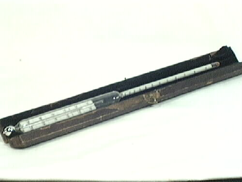Etuiet till mätaren är i trä och har en sammetsklädd yta inuti. En liten hasp låser fodralet.