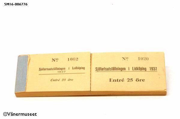 Biljetthäfte, gul färg. Med texten "Sjöfartsutställningen i Lidköping 1937 Entré 25 öre". Numrerat 1002-1100. 18 biljetter sålda.